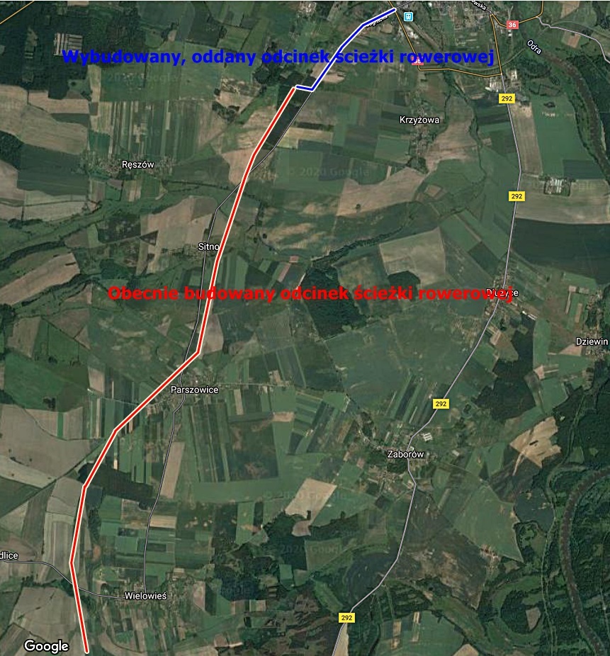 Podpisana jeszcze w grudniu ubiegłego roku umowa zakłada budowę asfaltowej ścieżki rowerowej o szerokości 3 metrów oraz łącznej długości około 9 kilometrów na odcinku Wielowieś-Ścinawa wraz z infrastrukturą towarzyszącą. Postępowanie wygrało Przedsiębiorstwo Budownictwa Drogowego z Głogowa, które w styczniu rozpoczęło prace. Obecnie wykonawca wyrównuje trasę i przygotowuje teren pod warstwę asfaltową na pierwszym odcinku, tj.: od nieczynnego przejazdu kolejowego przy drodze na Ręszów do skrzyżowania dawnego torowiska z drogą przed miejscowością Sitno.