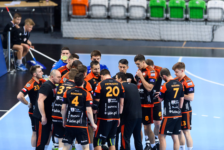 Gospodarze, którzy uważani byli za faworytów tego spotkania słabo wyszli w mecz. Katem miedziowych w pierwszych dziesięciu minutach okazał się ich były zawodnik. Piotr Adamczak zdobył cztery z siedmiu bramek dla swojej drużyny. W tym czasie lubinianie trafiali cztery razy. Już w dwunastej minucie o czas poprosił Bartłomiej Jaszka, a jego drużyna przegrywała w tym momencie 4:8. Goście zwietrzyli swoją szansę i po kwadransie prowadzili 11:5. Lubinianie gonili wynik, choć mieli utrudnione zadanie, bo co chwile lądowali na ławce kar. Pomimo tego cztery minuty przed końcem pierwszej połowy podopieczni Bartłomieja Jaszki i Jarosława Hipnera zmniejszyli stratę do trzech bramek. Taka przewaga utrzymała się do przerwy.