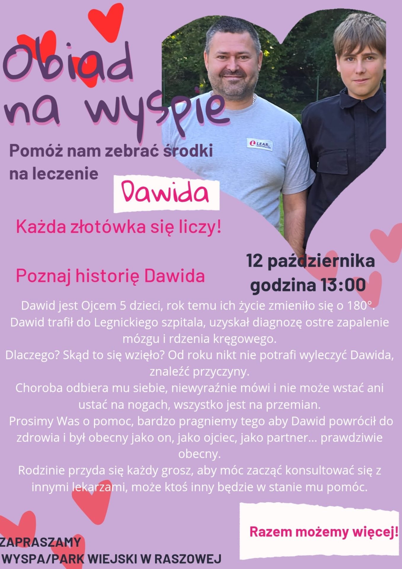 Już w najbliższą niedzielę, 12 października o godzinie 13.00, w parku wiejskim w Raszowej odbędzie się wyjątkowe wydarzenie – charytatywny obiad na wyspie, z którego dochód zostanie przeznaczony na pomoc Dawidowi, 41-letniemu ojcu pięciorga dzieci, zmagającemu się z ciężką i tajemniczą chorobą neurologiczną. Organizatorami wydarzenia są druhowie z Ochotniczej Straży Pożarnej w Raszowej, a pomysł wyszedł od… syna Dawida, który sam należy do OSP.