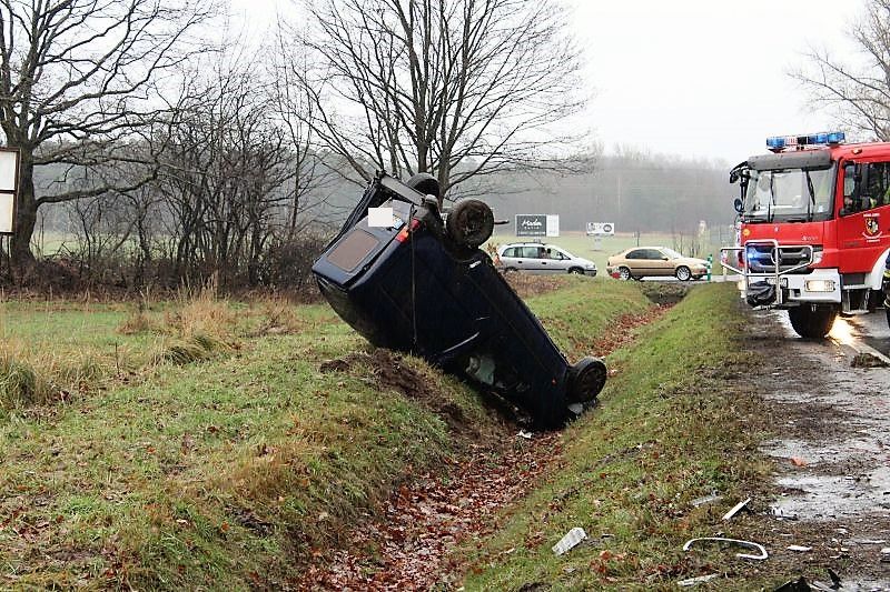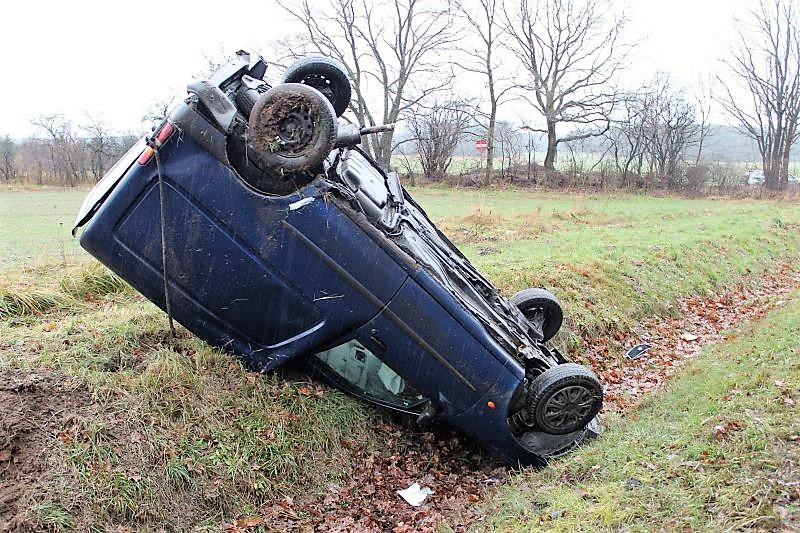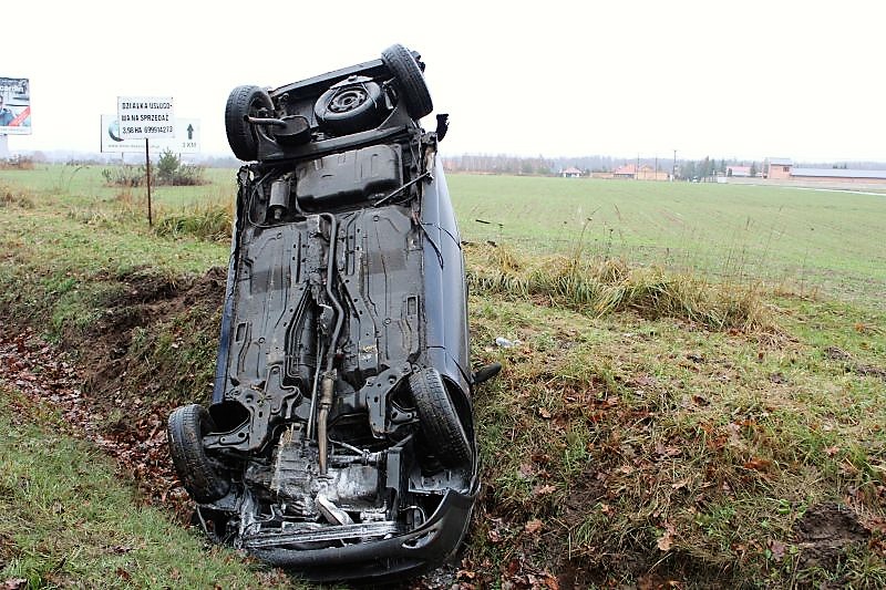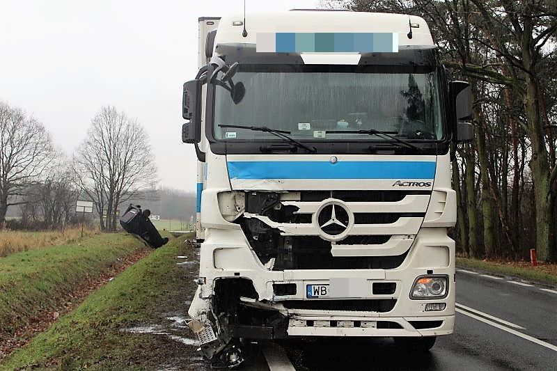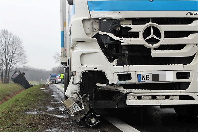 W wyniku zderzenia z tirem, ford zjechał do przydrożnego rowu i dachował. Dwie osoby trafiły do szpitala, są to kierowca i pasażerka forda. Obaj kierowcy byli trzeźwi.