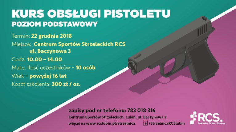 Kurs obsługi pistoletu odbędzie się 22 grudnia. Rozpocznie się o godzinie 10 i zakończy o 14. Zapisy przyjmowane są pod numerem telefonu 783 018 316.