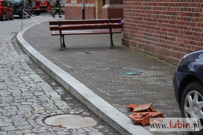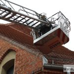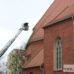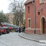 To na szczęście nie ogień. Interwencja strażaków była jednak konieczna, ponieważ okazało się, że z dachu tzw. dużego kościoła spadają dachówki. Rozpięte dookoła taśmy ostrzegają przechodniów przed ewentualnym niebezpieczeństwem. Strażacy zabezpieczają obluzowane karpiówki.