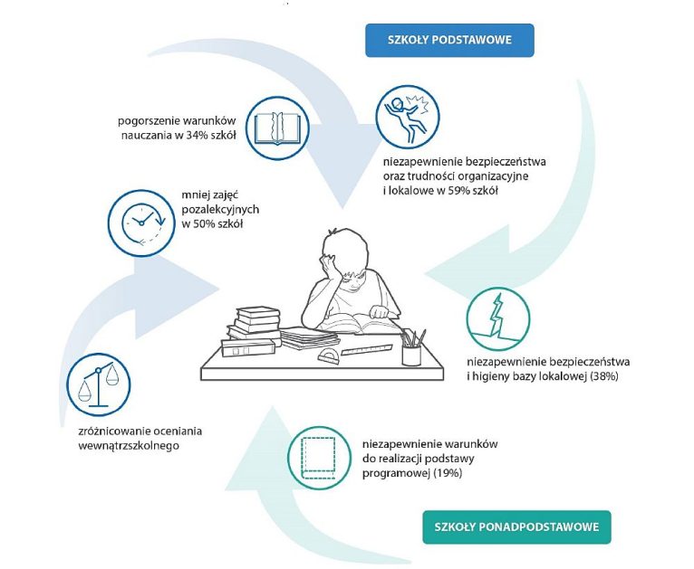 Gorsze warunki nauczania w co trzeciej szkole, mniej zajęć pozalekcyjnych w połowie z nich, a w większości naruszenie zasad bezpieczeństwa, trudności organizacyjne i lokalowe – to zaledwie kilka skutków ostatniej reformy oświaty, wskazanych w ostatnim raporcie Najwyższej Izby Kontroli. Wnioski z kontroli są zatrważające: w polskiej edukacji dzieje się coraz gorzej, a sporą winę za to ponosi ostatnia reforma, przeforsowana przez minister Annę Zalewską.
