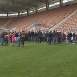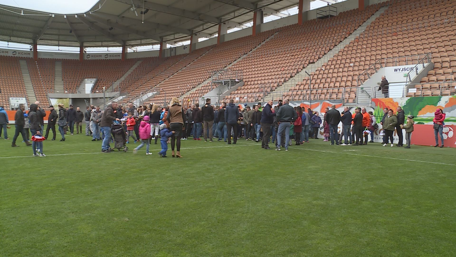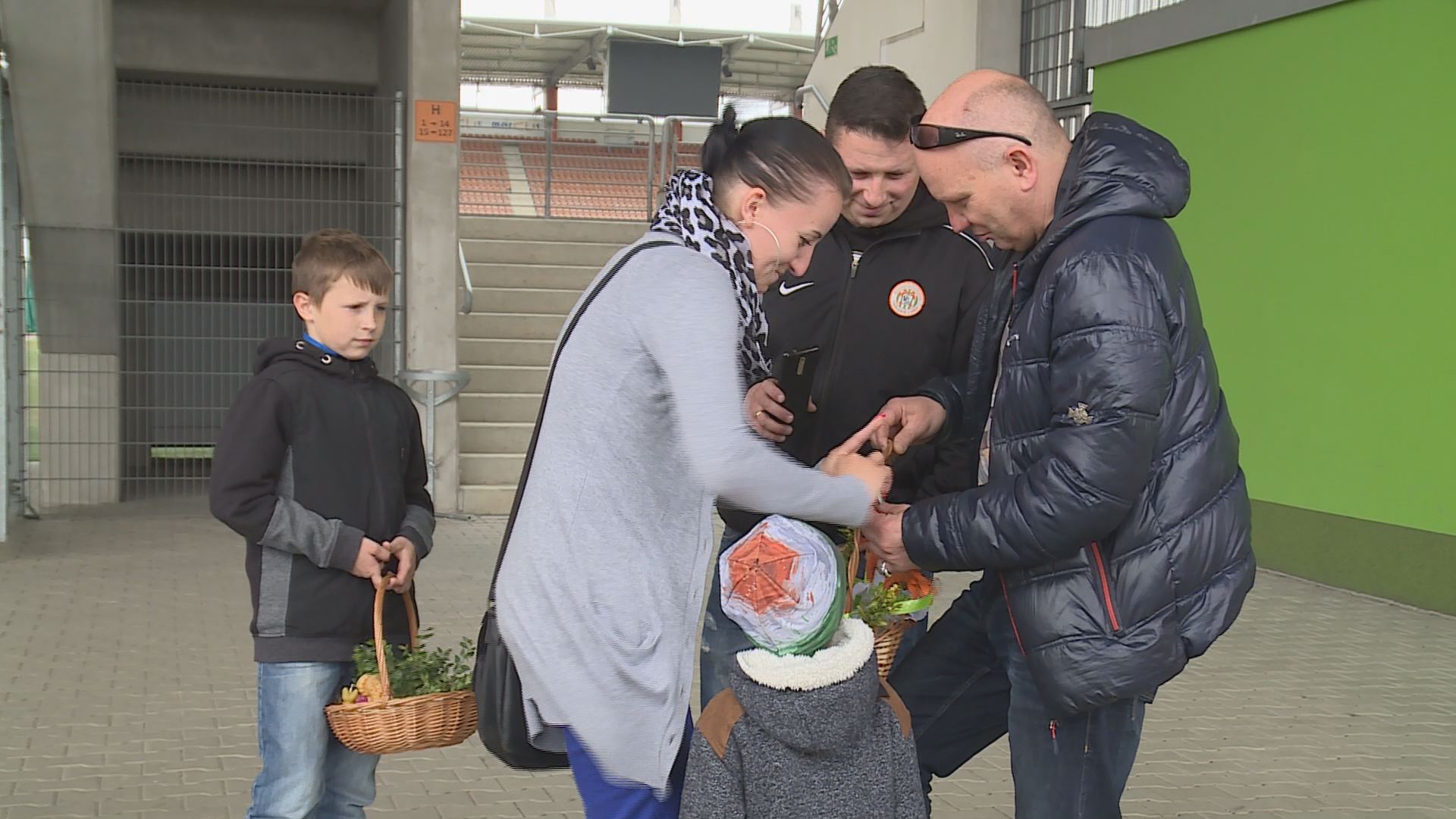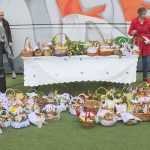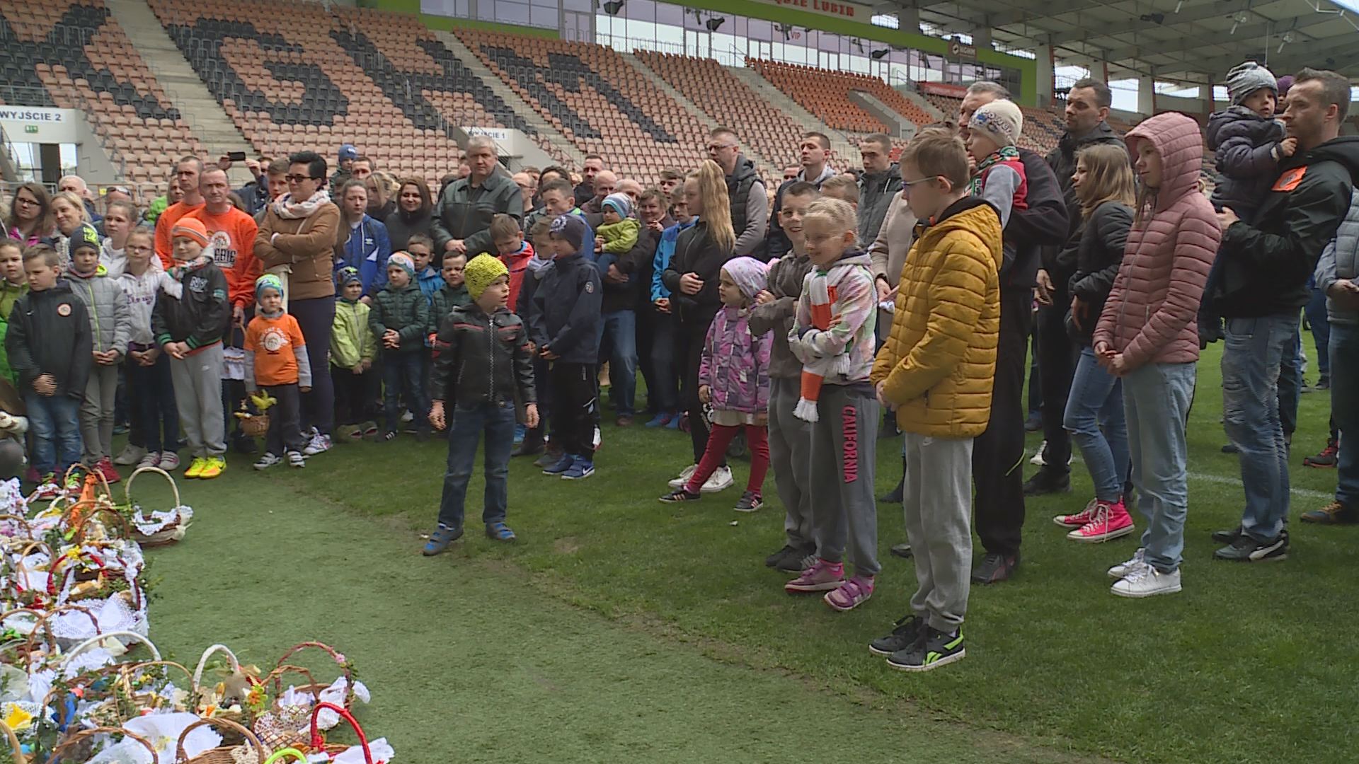 Tradycyjne święcenie pokarmów na płycie stadionu KGHM Zagłębia Lubin obyło się w tym roku po raz pierwszy. Pierwszy, ale z pewnością nie ostatni, bo wydarzenie przypadło mieszkańcom do gustu. Całymi rodzinami, mimo niesprzyjającej pogody, z barwnie przystrojonymi koszyczkami, licznie przybyli na tę niecodzienną uroczystość. Członkowie „miedziowej” rodziny mieli okazję pobyć razem, złożyć sobie życzenia i oczywiście poświęcić pokarmy. Ceremonię poprowadził ksiądz Remigiusz Tobera, kapelan klubu Zagłębia.