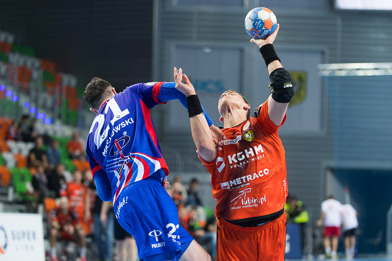 Na trafienie Jana Sobola mógł odpowiedzieć Jan Czuwara, jednak nie wykorzystał rzutu karnego. Chwilę później było 0:2, a bramkę zdobył Nikola Prce. Ten sam zawodnik podwyższył na 0:3. W piątej minucie wynik po stronie miedziowych otworzył Krzysztof Pawlaczyk. To dało sygnał do ataku i przed upływem dziesięciu minut lubinianie doprowadzili do remisu. Na prowadzenie chwilę później gospodarzy wyprowadził Jan Czuwara. Po dobrym okresie gry i prowadzeniu 8:7 w szeregi miedziowych wkradł się chaos. Gospodarze zaczęli popełniać błędy, nie wykorzystywali dogodnych sytuacji. Goście skorzystali z takiego obrotu spraw i było 8:11. Podopieczni Pawła Nocha i Adriana Anuszewskiego w porę się obudzili i zmniejszyli straty do jednej bramki. Pięć minut przed końcem pierwszej połowy atomowym rzutem z drugiej linii Mikołaj Szymyślik doprowadził do remisu po 13. Przed drugą połową wynik był sprawą otwartą, bo do przerwy było 16:18.
