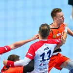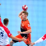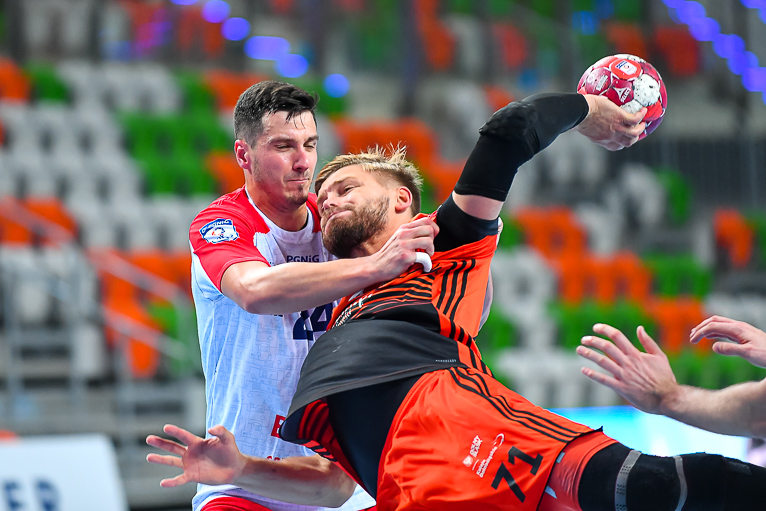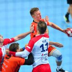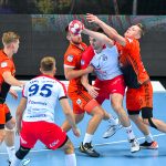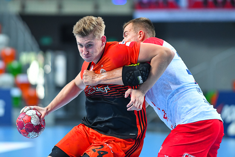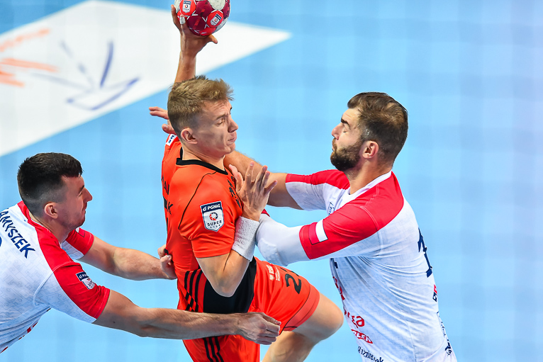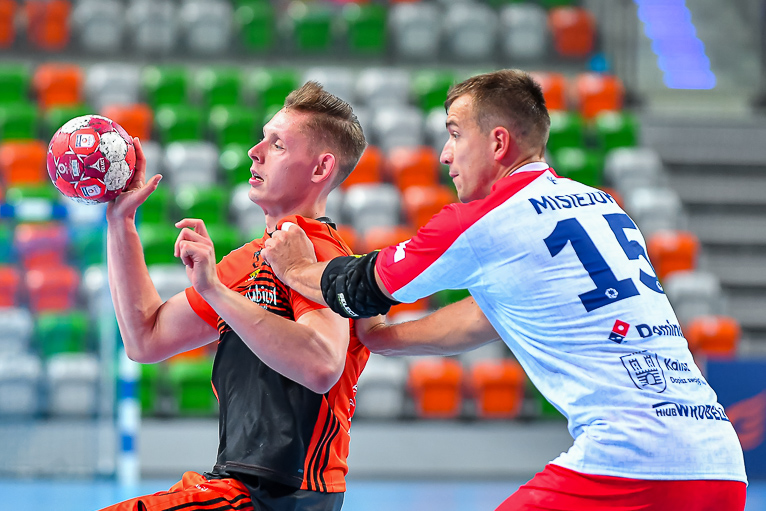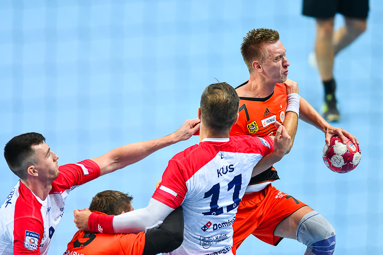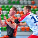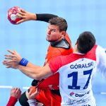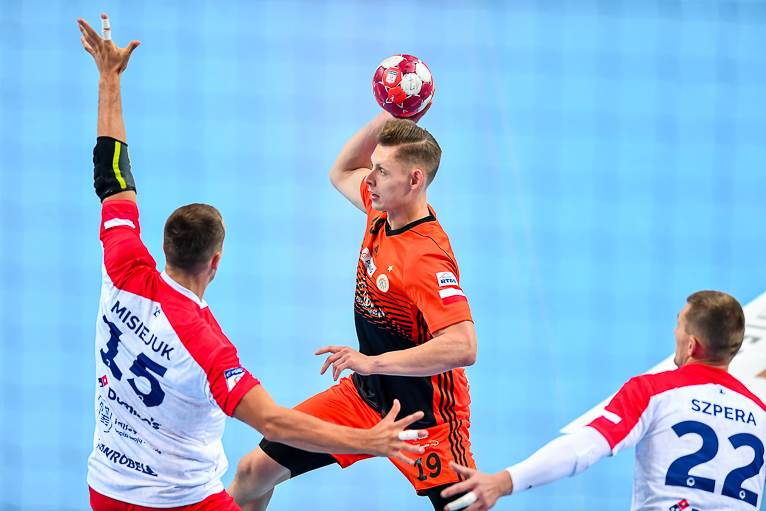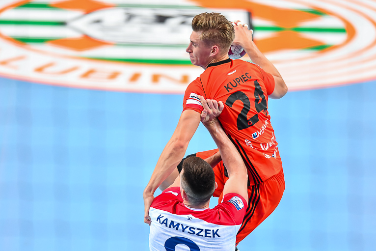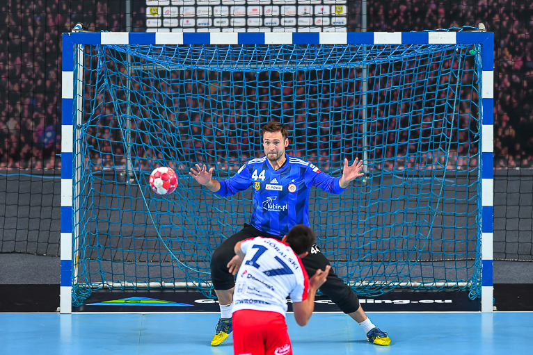 Głód gry widać było u zawodników obu drużyn już od samego początku. W starciu dwóch zespołów o podobnych potencjałach spodziewaliśmy się sporych emocji i już pierwsze minuty te emocje zwiastowały. W mecz lepiej weszli Miedziowi, którzy w dziesiątej minucie prowadzili 5:3. Później „odpalił” Marek Szpera, rzucając trzy bramki z rzędu. Po kwadransie mieliśmy remis po 6 i dalszą walkę bramka za bramkę. W kolejnych fragmentach lepiej prezentowali się goście, a ich skuteczna gra sprawiła, że po dwudziestu minutach na tablicy wyników było 7:10. Lubinianie zmniejszyli straty, ale do przerwy o dwie bramki lepsi byli przyjezdni.