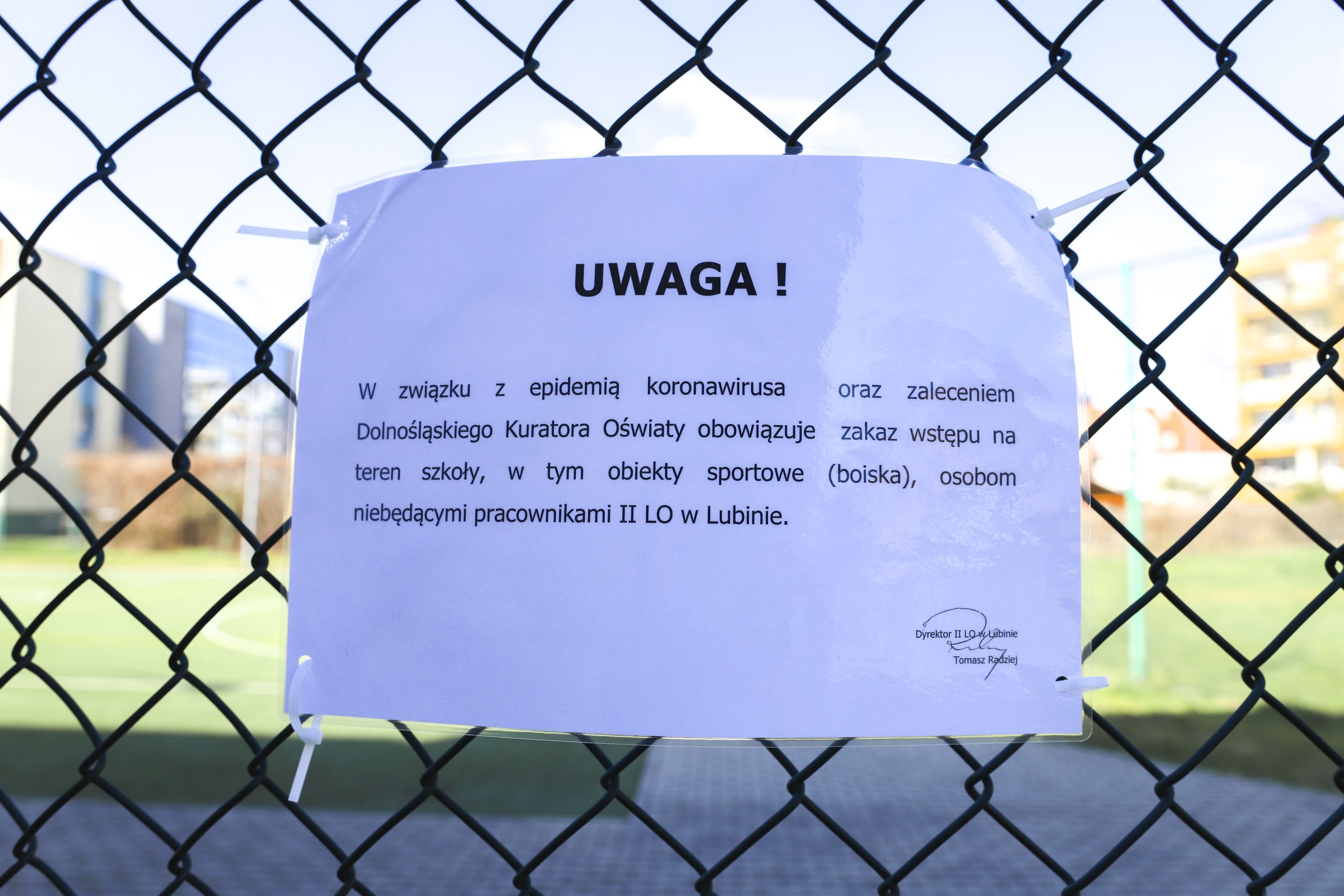 „W związku z epidemią koronawirusa bardzo proszę o wydanie zakazu wstępu na teren szkół, przedszkoli i placówek osobom nie będącym ich pracownikami. W szczególności chodzi o obiekty sportowe, gdzie gromadzą się uczniowie i okoliczni mieszkańcy, organizując amatorskie rozgrywki”