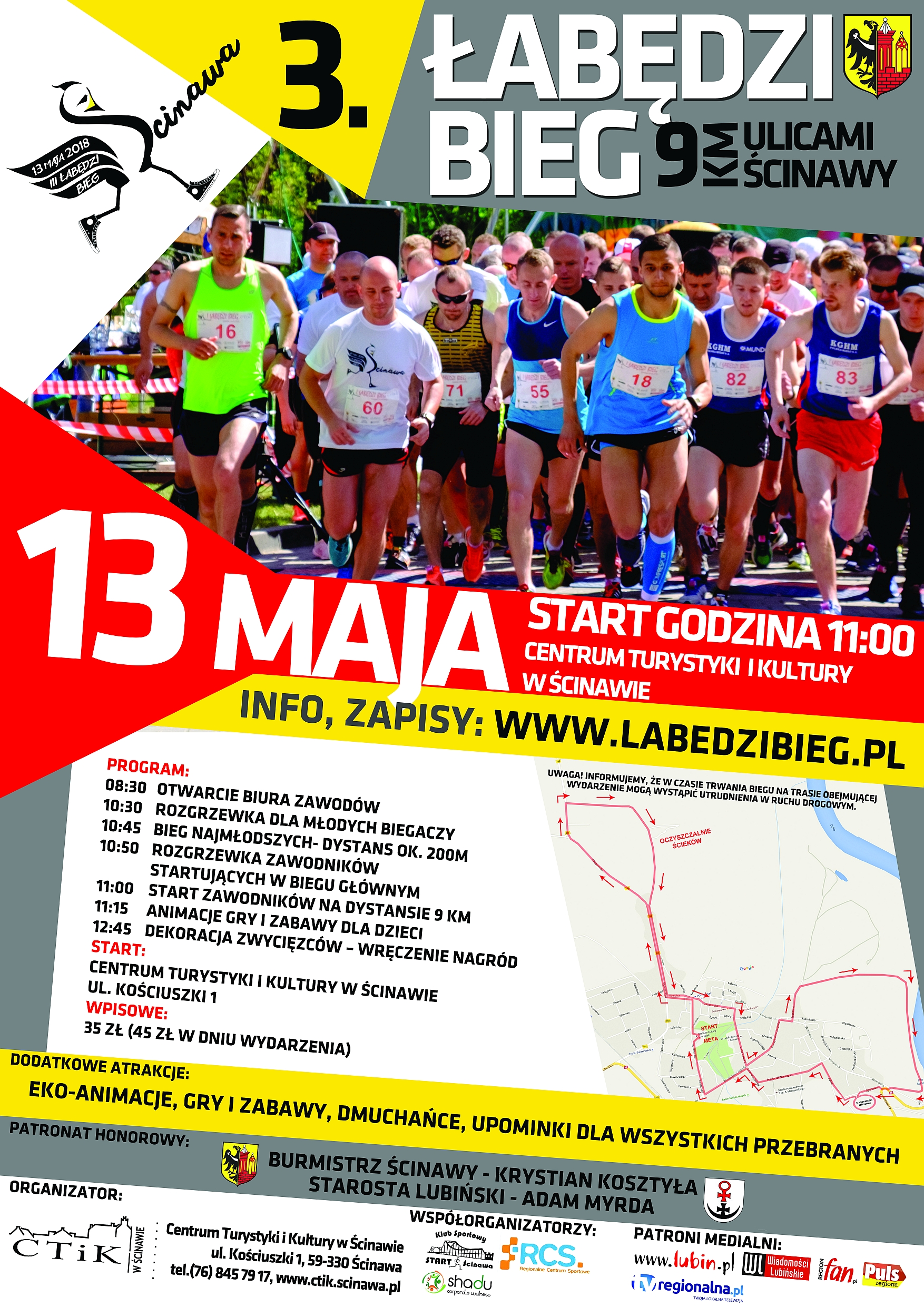 Malownicza trasa Łabędziego Biegu w Ścinawie po raz kolejny zapraszać będzie nad Odrę. Centrum Turystyki i Kultury w Ścinawie, Klub sportowy Start Ścinawa, Stowarzyszenie Nordic Walking, RCS Lubin już po raz trzeci organizują wielkie sportowe wydarzenie dla wszystkich miłośników sportu.