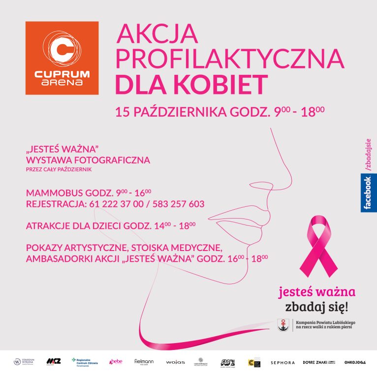 Tak jak w ubiegłym roku, kampania „Jesteś ważna” zagości również w Galerii Cuprum Arena. Już w środę, 15 października, w Światowy Dzień Walki z Rakiem Piersi, będzie tam można m.in. porozmawiać z lekarzami, zdobyć bezpłatne zaproszenia na badania USG czy wziąć udział w warsztatach edukacyjnych.