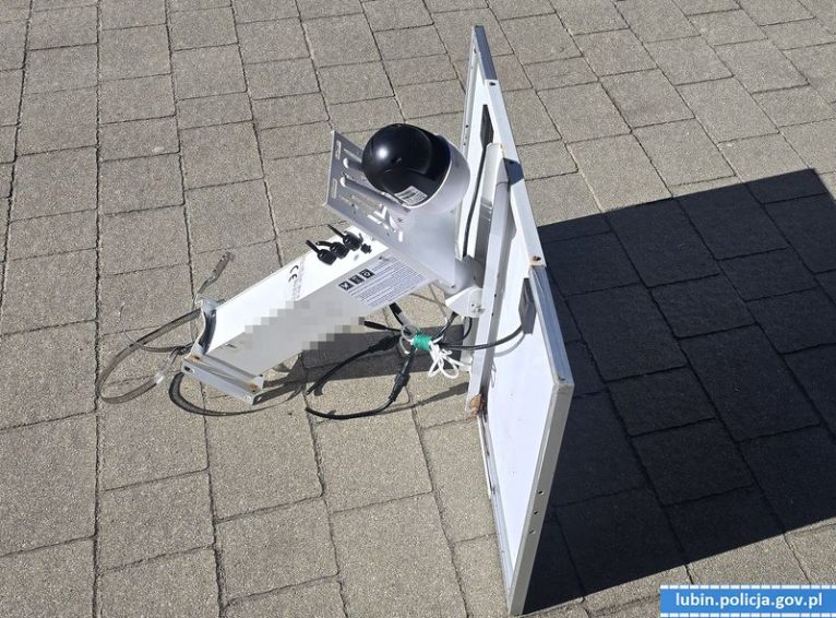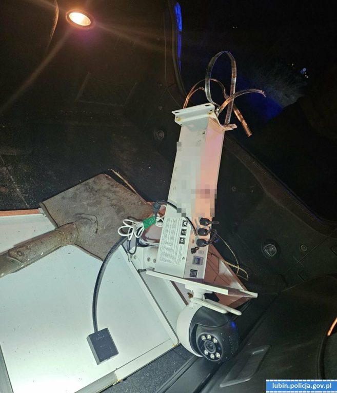 Mundurowi postanowili sprawdzić samochód. W bagażniku znaleźli kamerę wraz z panelem solarnym. Urządzenie miało obcięte przewody zasilające, a zaciski montażowe były rozerwane. Pod siedzeniem pasażera policjanci natrafili natomiast na narzędzia, w tym łom i łopatę.