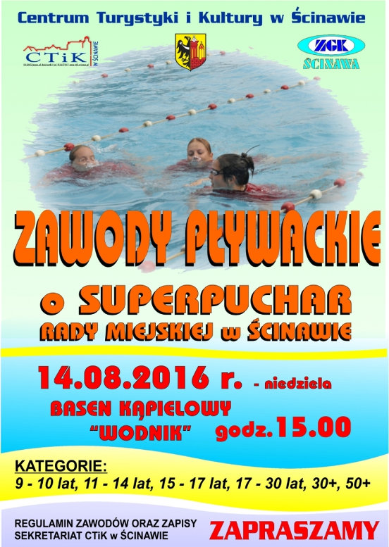 Regulamin Zawodów Pływackich o Superpuchar Rady Miejskiej w Ścinawie oraz zapisy w sekretariacie Centrum Turystyki i Kultury w Ścinawie.