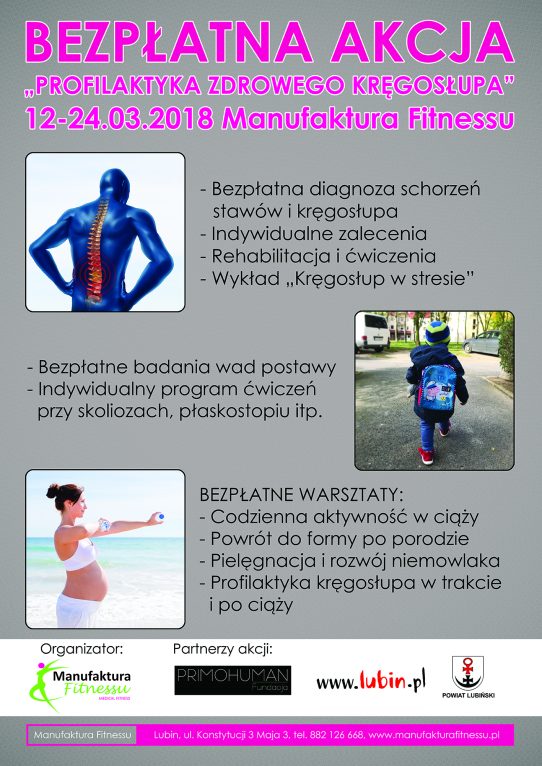 Akcję organizuje klub Manufaktura Fitnessu. Jak podkreślają organizatorzy, jest ona bezpłatna i skierowana do mieszkańców całego powiatu. W ramach badań chcielibyśmy przebadań grupy najbardziej zagrożone dysfunkcjami kręgosłupa oraz bólami wynikającymi z nieprawidłowej postawy i złych nawyków w życiu codziennym.