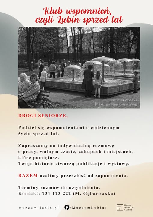 Spotkania odbywają się w ramach cyklu „Klub wspomnień, czyli Lubin sprzed lat” zainicjowanego przez Muzeum Historyczne jesienią ubiegłego roku. Do tej pory udało się porozmawiać i zebrać wspomnienia od kilkunastu Lubinian. Z seniorami podczas indywidualnych spotkań rozmawia Magdalena Gębarowska.