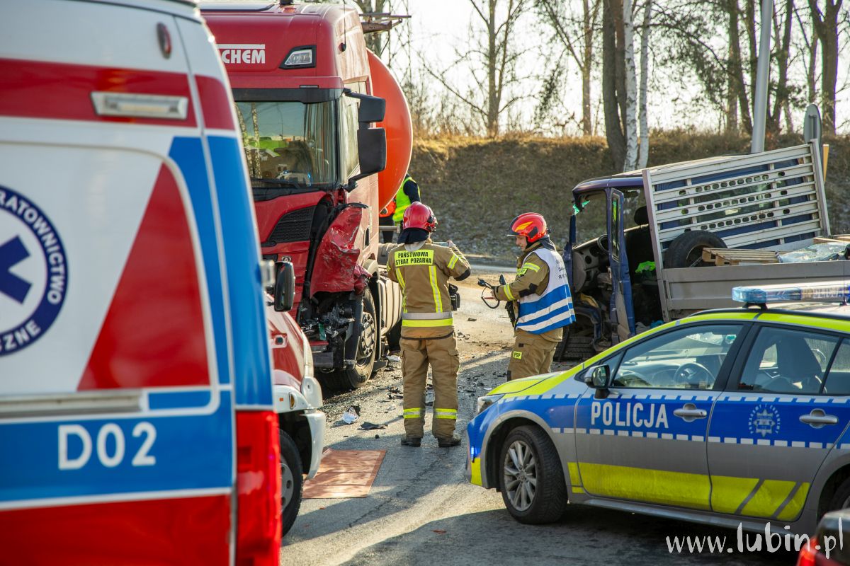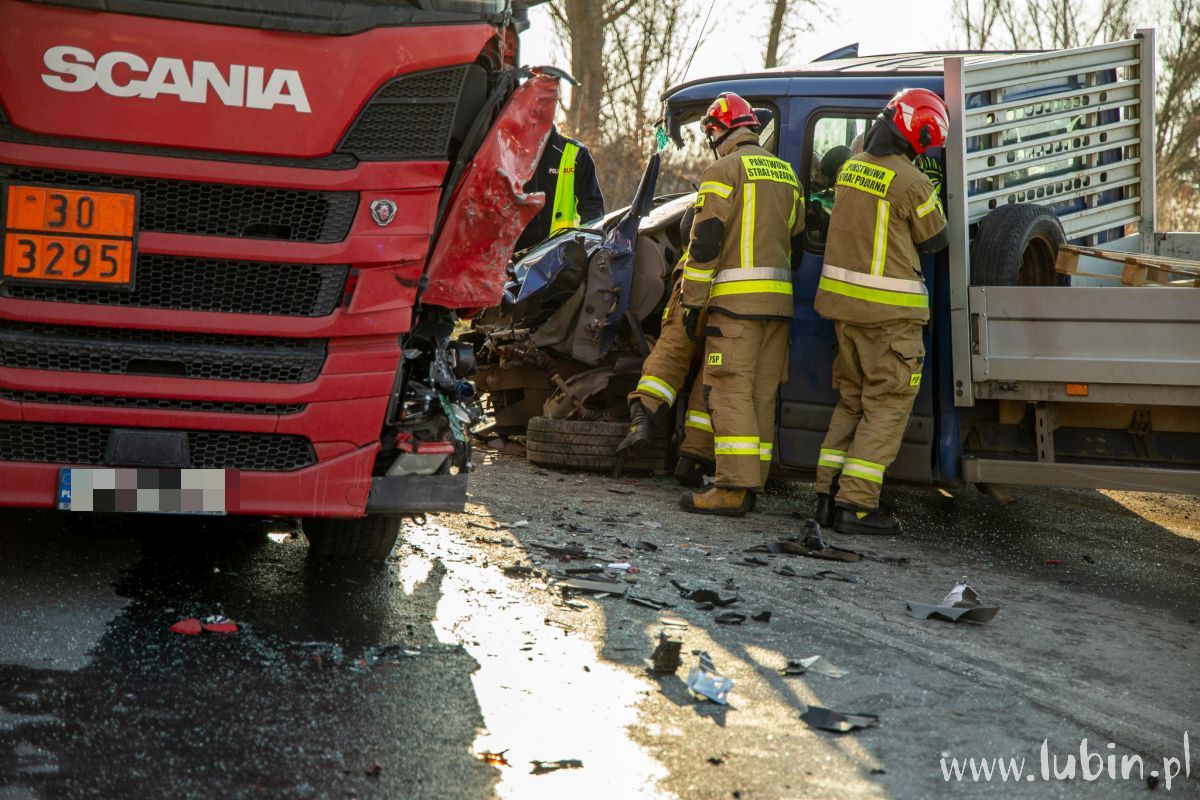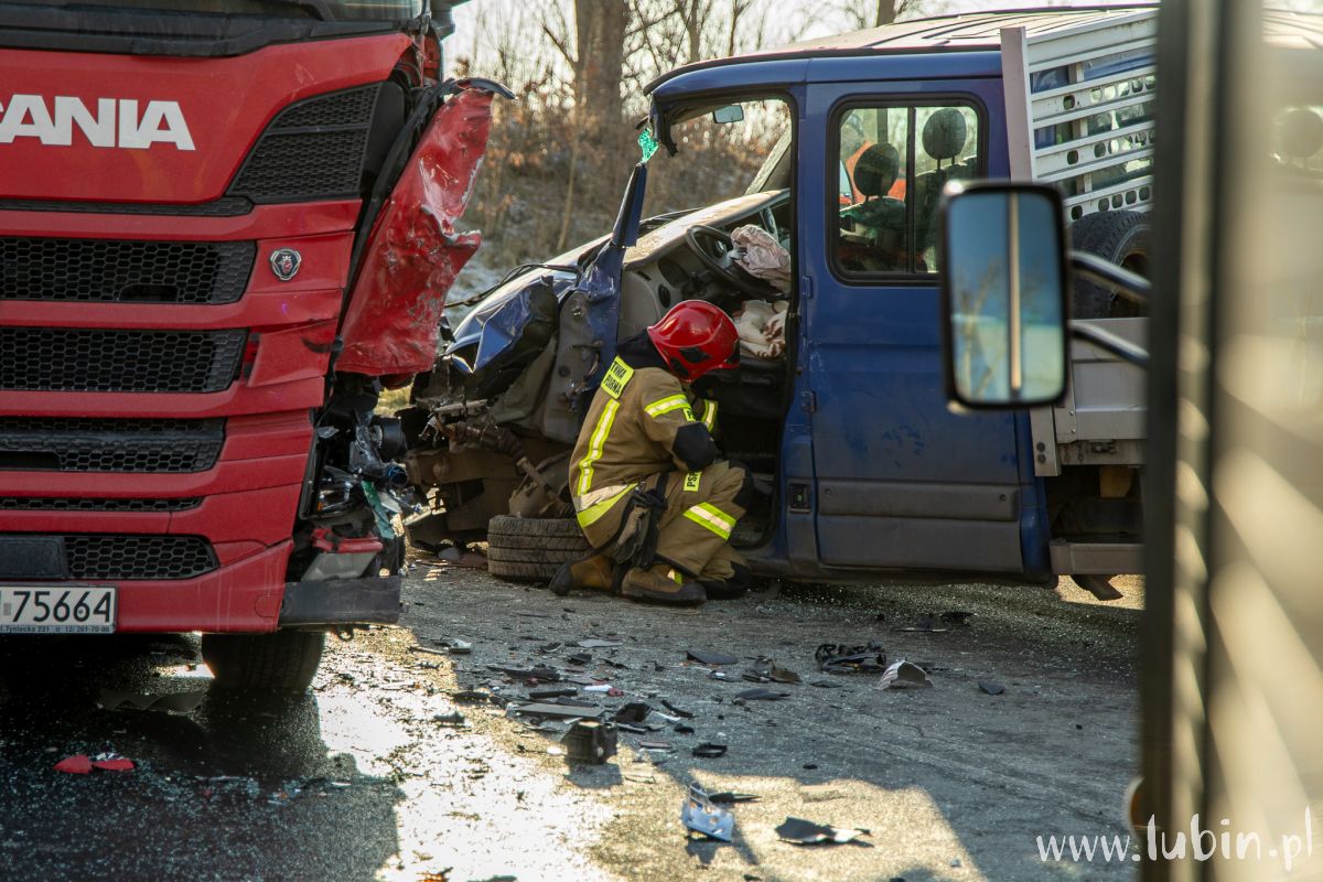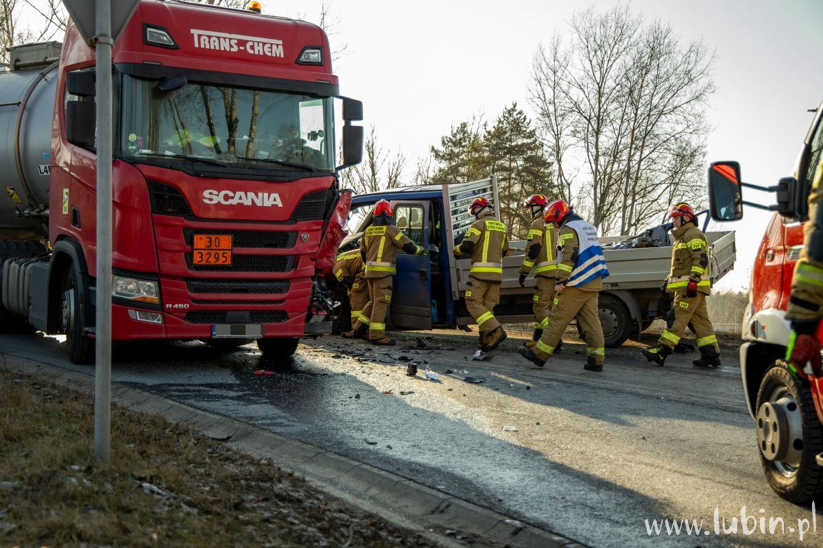 Na miejscu pracują także strażacy, którzy uwolnili z pojazdu 76-latka. – Po przejeździe na miejsce zdarzenia zabezpieczyliśmy miejsce zdarzenia, po czym przystąpiliśmy do wykonania dostępu do kierowcy za pomocą sprzętu hydraulicznego. Jednocześnie monitorowaliśmy stan zdrowia poszkodowanego – mówi st. kpt. Karol Baran, zastępca dowódcy jednostki ratowniczo-gaśniczej z Komendy Powiatowej Państwowej Straży Pożarnej w Lubinie.