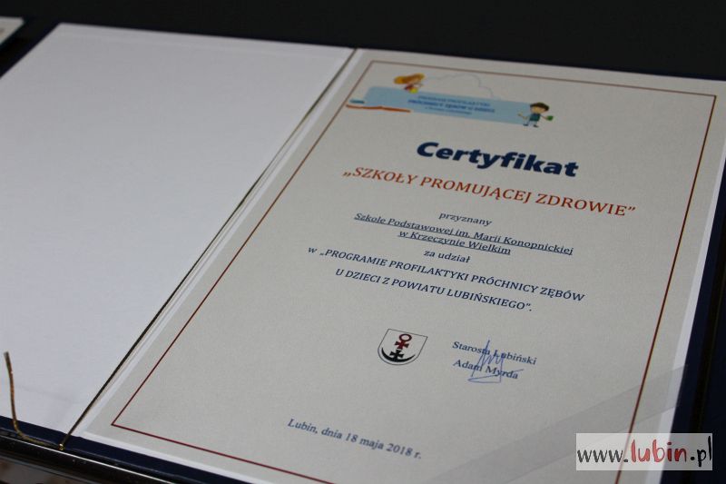 Przedstawiciele każdej ze szkół i przedszkoli, które przyłączyły się do programu, odebrali dziś certyfikat „Szkoły promującej zdrowie”. Te z placówek, które będą najbardziej aktywne, pojadą wraz ze swoimi uczniami do Wrocławia. – W ramach programu dzieci zostaną przebadane w klinice ortodoncji we Wrocławiu, gdzie sprawdzimy czy mają właściwy zgryz. Jeżeli będą takie potrzeby, dzieci zostaną objęte programami i leczeniem, realizowanym pod auspicjami krajowego konsultanta do spraw ortodoncji – tłumaczy Michał Huzarski, pełnomocnik zarządu powiatu lubińskiego do spraw promocji i ochrony zdrowia.