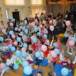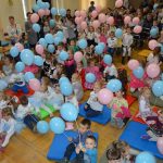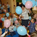 Na zakończenie każdy uczestnik przeglądu w nagrodę za występ otrzymał pamiątkową przypinkę, stojaczek na szczoteczkę do zębów oraz różowe i niebieskie balony z nadrukiem V Zimowy Przegląd Artystyczny Dzieci Przedszkolnych.