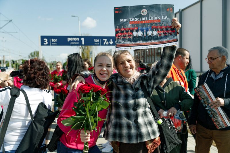 Dziś piłkarki Zagłębia spotkały się z kibicami na stacji Lubin. Kiedy tylko wysiadły z pociągu, usłyszały gromkie brawa. Były uściski, gratulacje, wspólne zdjęcia, a nawet łzy, bo jedna z najwierniejszych kibicek zapomniała telefonu, którym chciała zrobić pamiątkowe zdjęcia. – Spokojnie, prześlemy Pani – uspokajały dziewczyny.