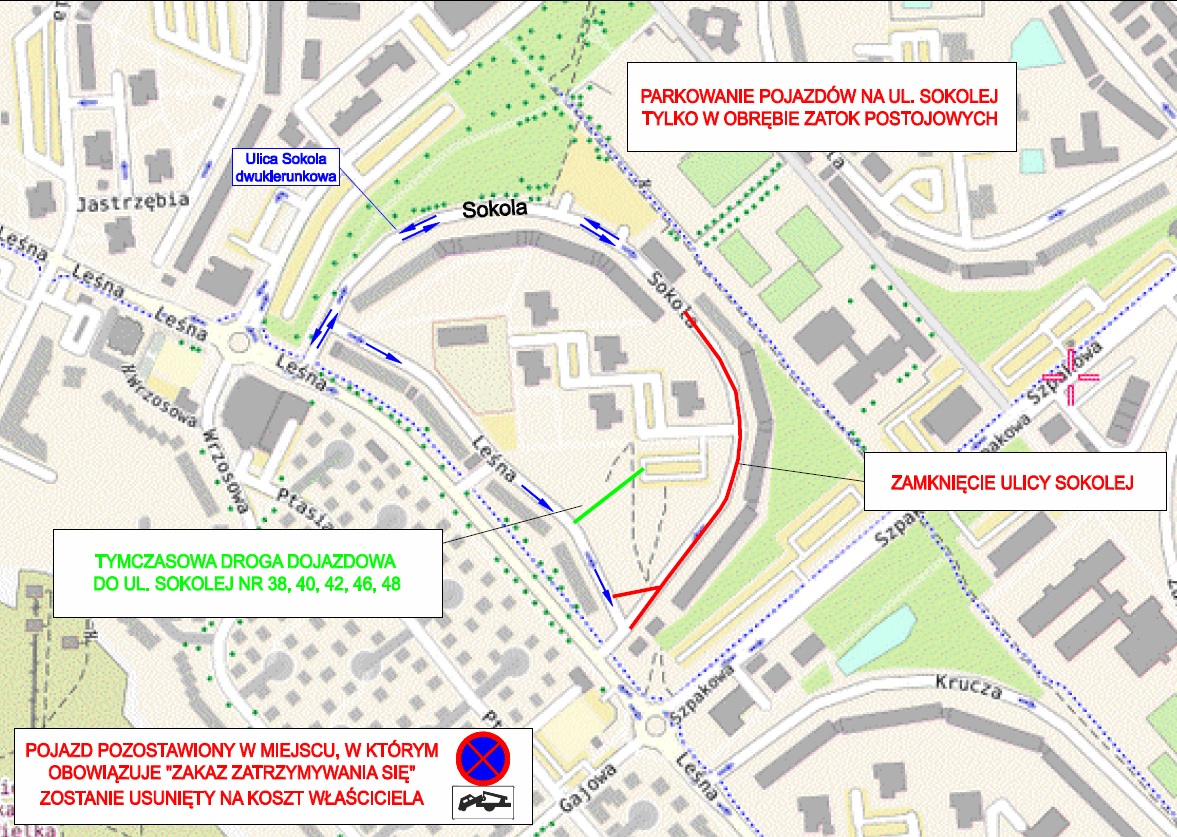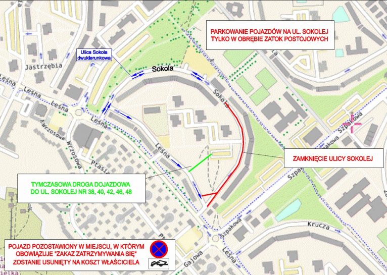 W ramach inwestycji wymieniona zostanie nawierzchnia ulicy Sokolej od numeru 35 do skrzyżowania z ulicą Leśną. W związku z pracami, które rozpoczną się 13 września, ten odcinek drogi zostanie całkowicie wyłączony z ruchu. Nie będzie można tam też parkować. Ale to nie wszystkie zmiany. Ponadto na odcinku Sokolej od numeru 2 do 36 wprowadzony zostanie ruch dwukierunkowy oraz zakaz zatrzymywania aut wzdłuż chodnika.