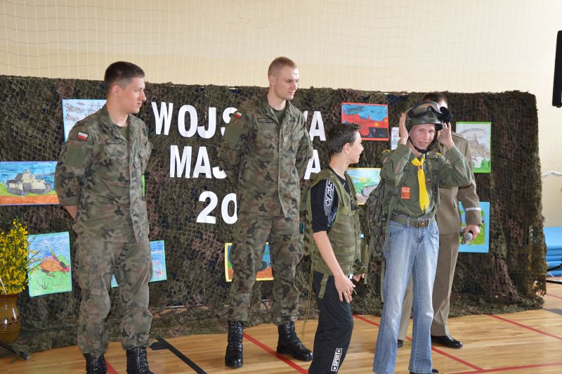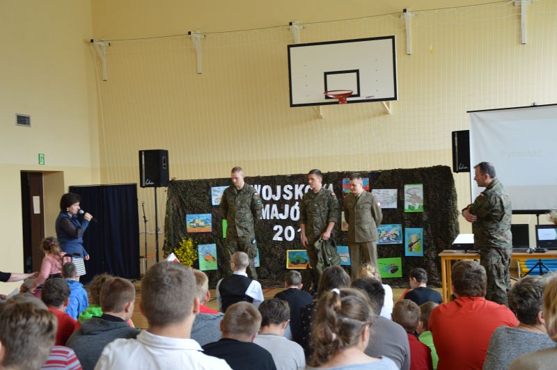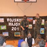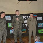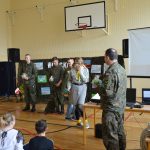 Na koniec bardziej ciekawi uczniowie zadawali pytania i przymierzali sprzęt oraz wyposażenie wojskowe. Na koniec każdy z żołnierzy otrzymał drobny upominek i zrobiono pamiątkowe zdjęcie grupowe.