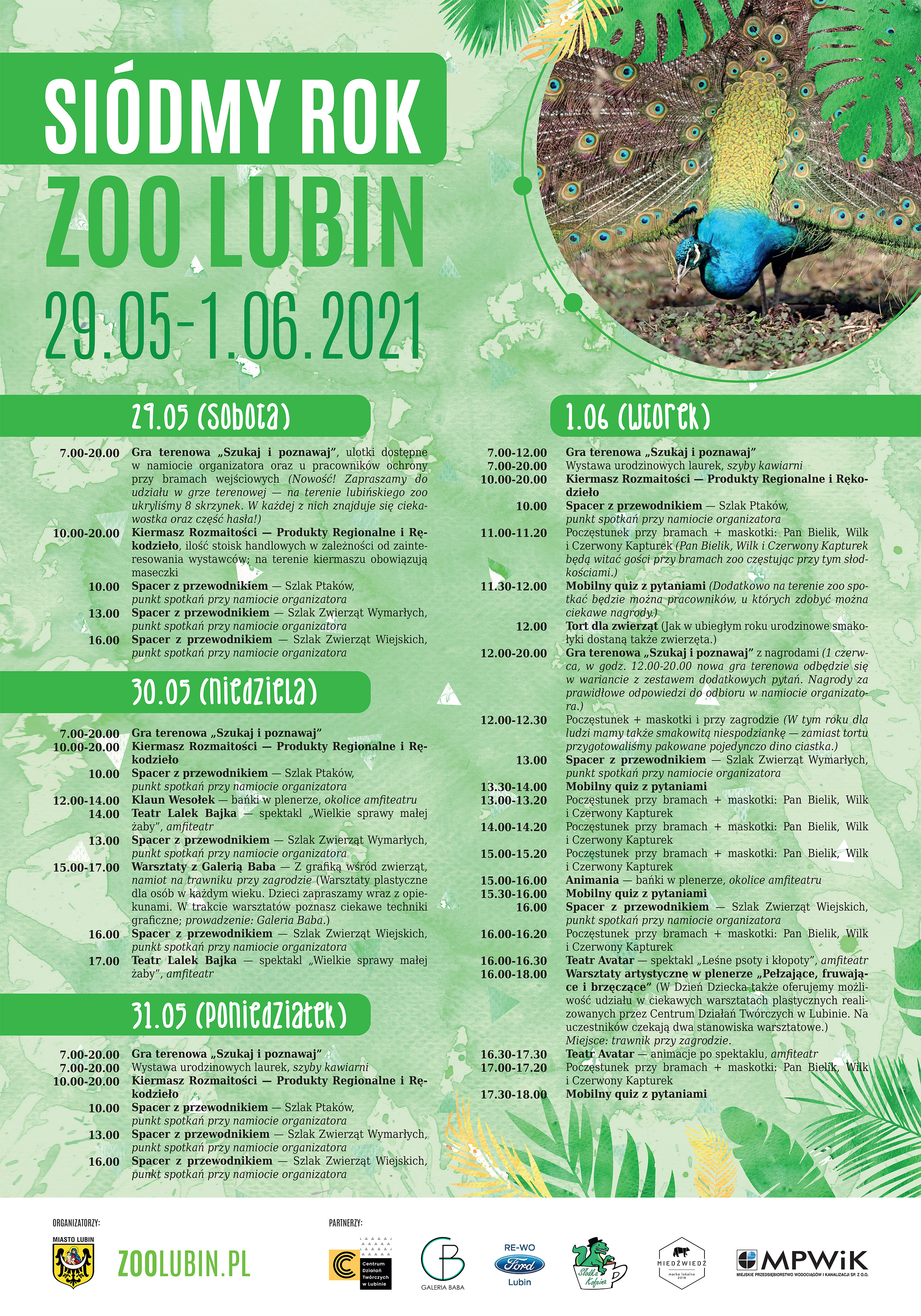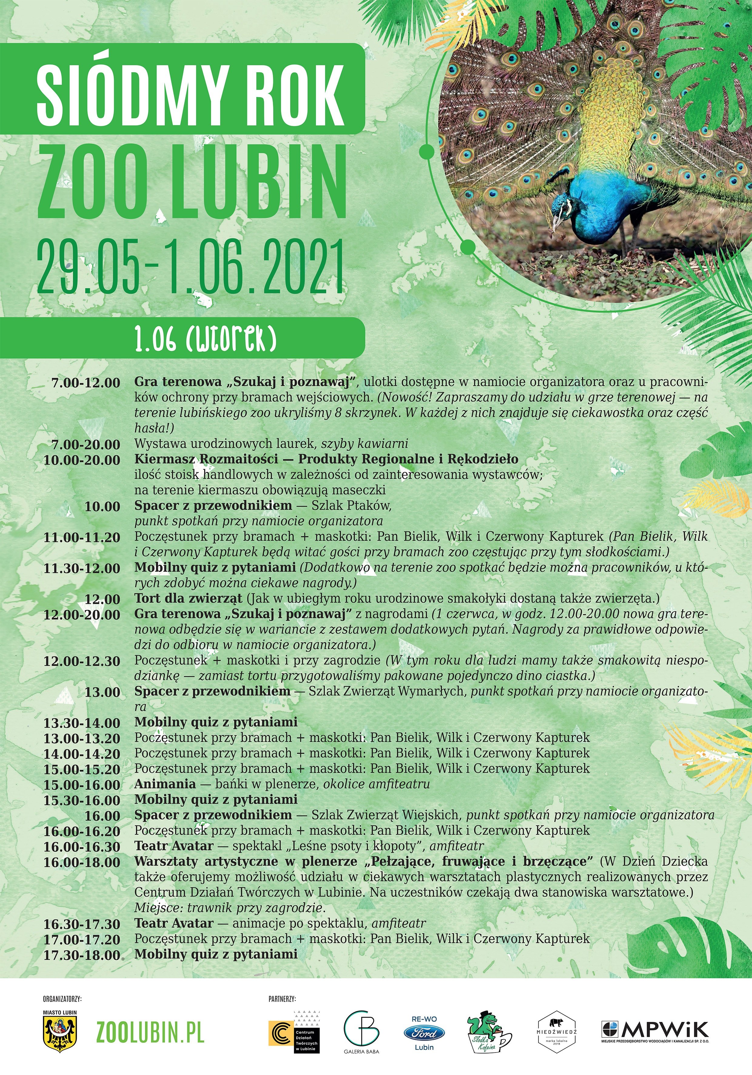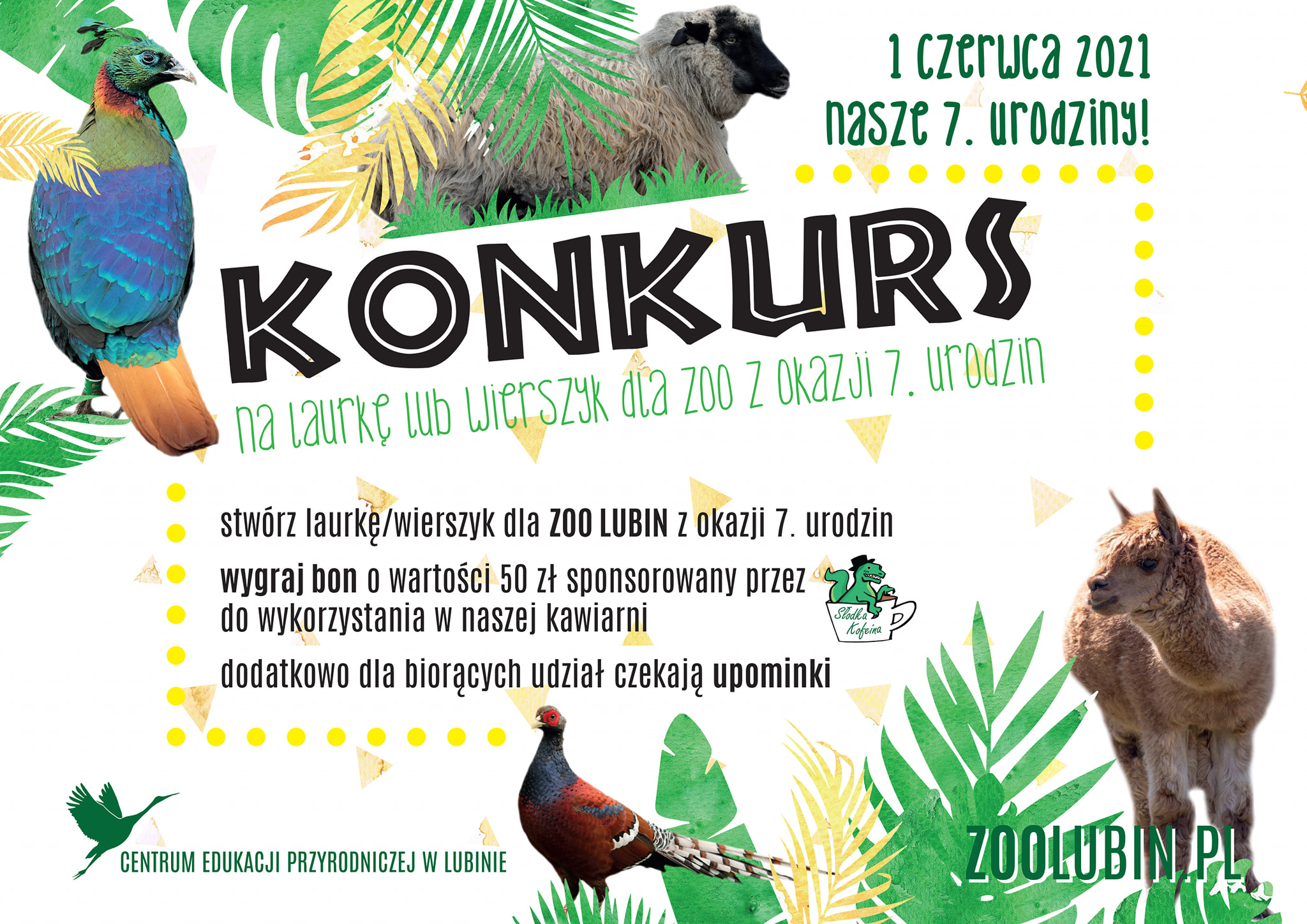 Na początek ogłoszono konkurs na laurkę lub wierszyk dla zoo z okazji siódmych urodzin. Gotową pracę należy wrzucić do 29 maja do specjalnej skrzynki ustawionej w kawiarni. Do wygrania jest bon o wartości 50 zł do zrealizowania w kawiarni w parku Wrocławskim. Ponadto 20 losowo wybranych osób, które wezmą udział w konkursie, otrzyma upominki od zoo. Wszystkie prace zostaną zaprezentowane 30 maja na profilu facebookowym zoo. Bon wygra osoba, której laurka/wierszyk zyska największą liczbę polubień. Głosowanie zakończy się 1 czerwca o godzinie 22.