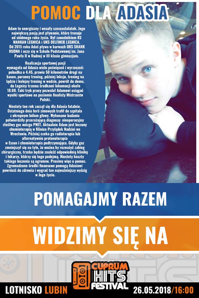 Licznik za stronie, gdzie trwa zbiórka, cały czas się kręci, a mimo to, pieniędzy wciąż brakuje. W pomoc angażuje się całe lokalne środowisko, w tym przyjaciele z klubu pływackiego z Rudnej, gdzie trenował dotąd chłopak. Pomocną dłoń wyciągają też organizatorzy Cuprum Hits Festival, który właśnie 26 maja odbędzie się na lubińskim lotnisku. Tradycją jest już, że podczas festiwali muzycznych organizowanych przez agencję Events Factory zbierane są środki dla potrzebujących. Tym razem wolontariusze z puszkami będą zbierać pieniądze właśnie dla Adama.
