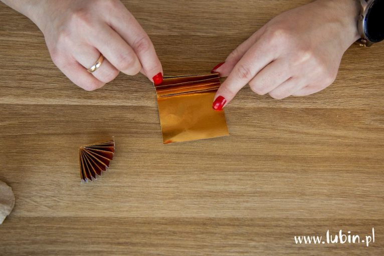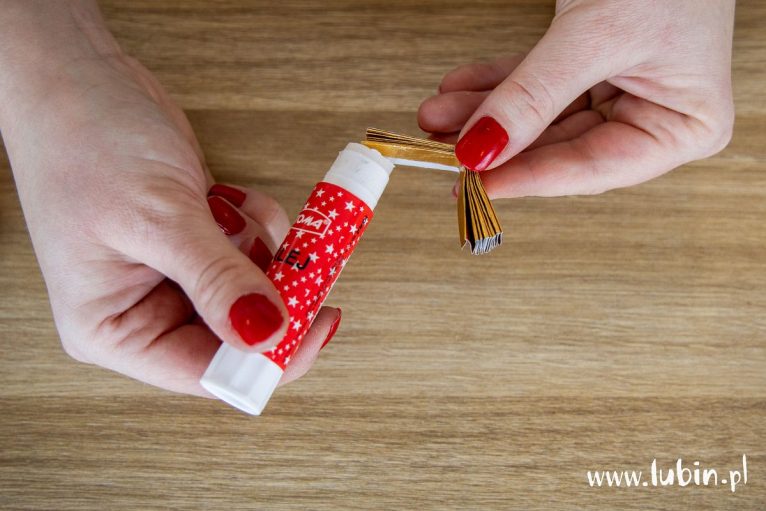 3. Wewnętrzne boki zgiętej harmonijki smarujemy klejem i przytrzymujemy, aż klej przyschnie. Powstają w ten sposób skrzydełka.