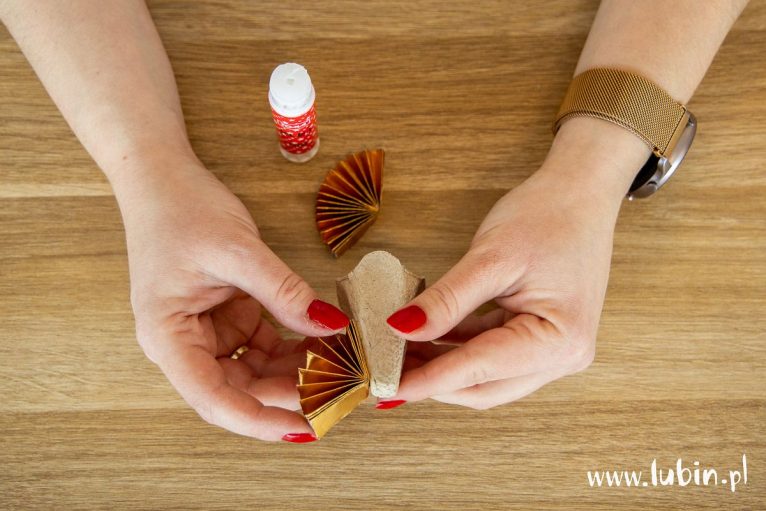 4. Następnie jeden bok każdego skrzydła smarujemy klejem i przyklejamy po dwóch stronach wytłoczki, którą wcześniej wycięliśmy z wytłaczanki.