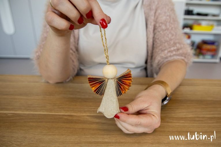 6. Na sznureczek od góry nawlekamy drewniany koralik, który staje się głową naszego aniołka. Ozdoba gotowa.