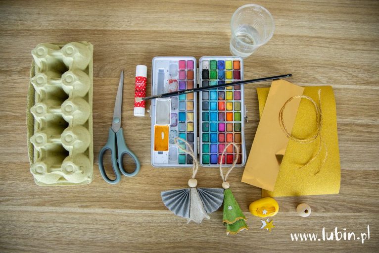 Zarówno aniołka, jak i choinkę można pomalować farbkami lub mazakiem, a także ozdobić przyklejając np. gwiazdki wycięte z papieru. Najlepiej jednak zrobić to na początkowym etapie – zaraz po wycięciu pojedynczych wytłoczek z wytłaczanki.