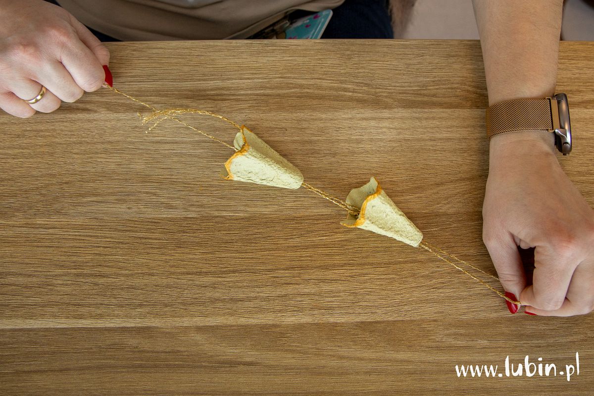 5. W wytłoczce na górze robimy dziurkę, przez którą następnie przeciągamy sznureczek, robiąc z jego końców supeł pod spodem.