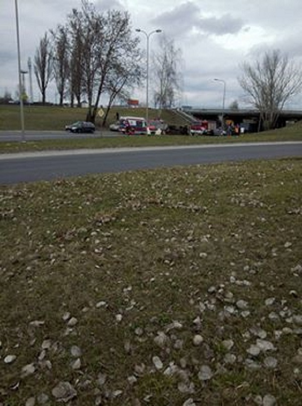 Ten komunikat wywołał poruszenie wśród służb ratunkowych – ktoś zadzwonił z informacją, że auto spadło z wiaduktu. Rzeczywiście tak to mogło wyglądać, bo samochód leżał przewrócony na bok.