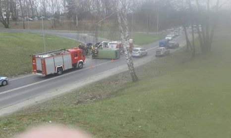 W wyniku zderzenia żuk przewrócił się na bok.