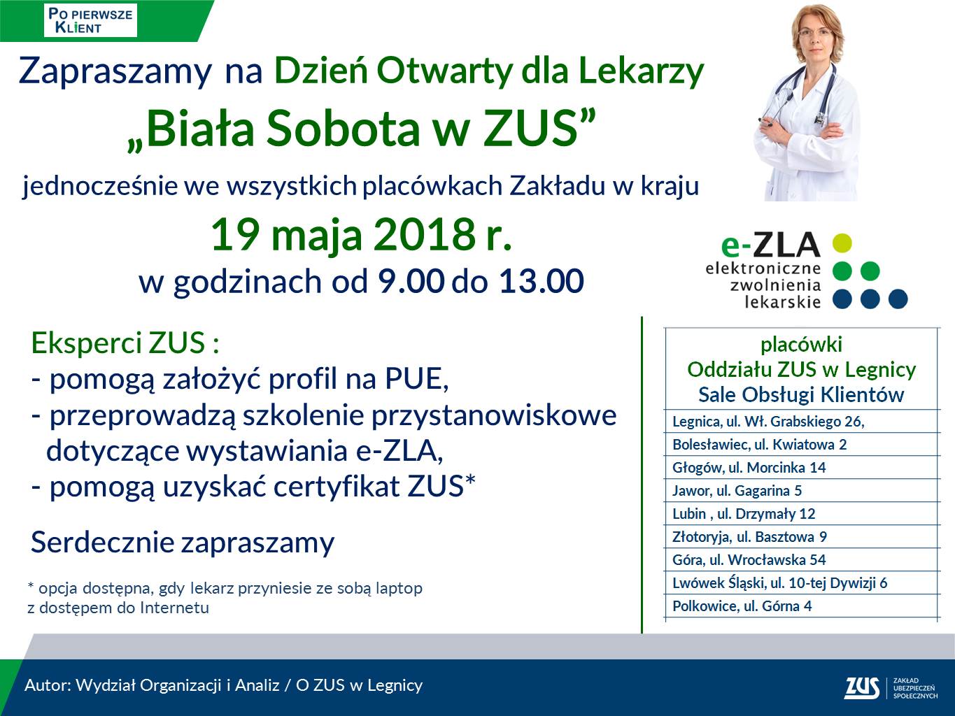 ZUS zaprasza lekarzy na Białą Sobotę 19 maja w godzinach 9.00–13.00 do wszystkich placówek ZUS na całym Dolnym Śląsku.