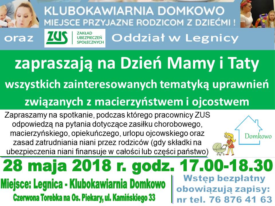 Wszystko o urlopach macierzyńskim, tacierzyńskim, o zasiłku chorobowym – opowiedzą pracownicy legnickiego ZUS. Zakład zaprasza na Dzień Mamy i Taty do swojej placówki.