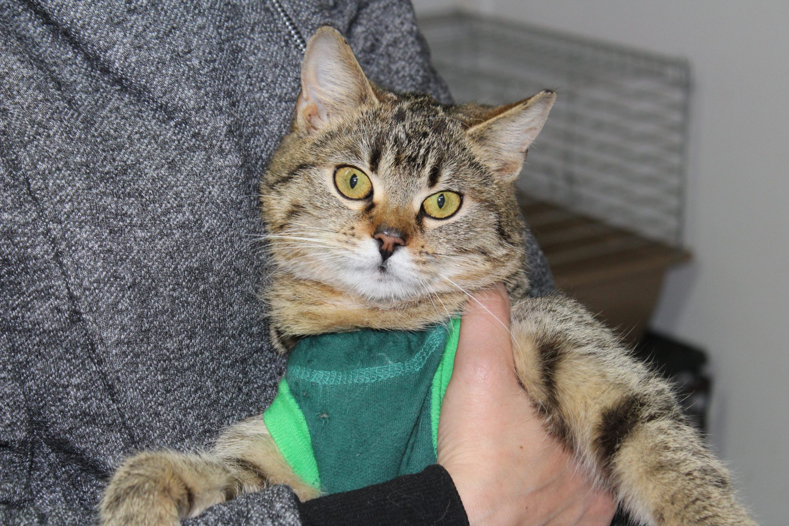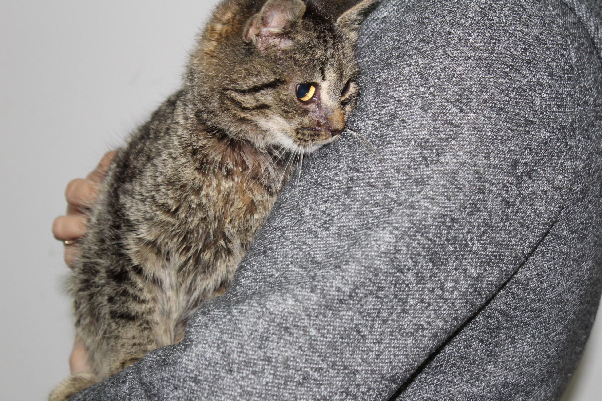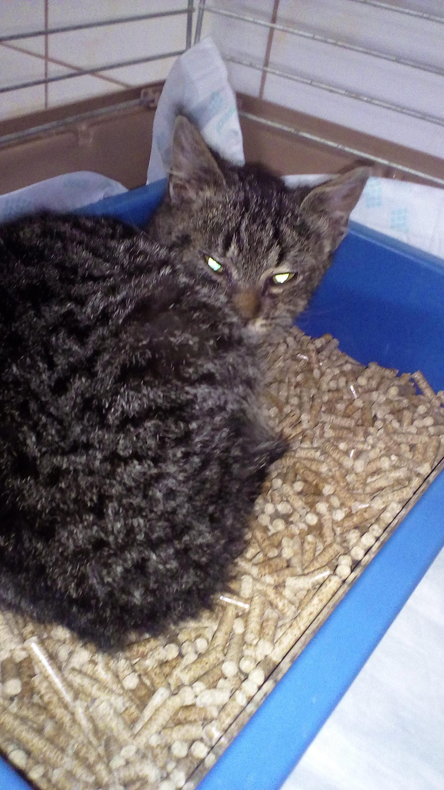 Kitten: odłowiony na ul. Mickiewicza, 5-6-miesięczny buro-pręgowany kotek. Jego stan nie jest za dobry, ma gorączkę, koci katar, kalicywirozę, prawdopodobnie robaczycę. Obecnie w trakcie leczenia.