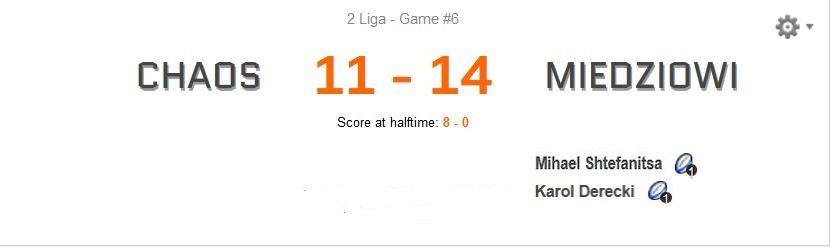 Wynik do przerwy to 8:0 dla Chaosu. W drugiej połowie Miedziowi ewidentnie wzięli sobie do serca słowa kontuzjowanego zawodnika, który na „odchodne” wydusił z siebie: „Bez zwycięstwa nawet nie wracajcie” i ruszyli do odrabiania strat. Jednak to poznaniacy zdobyli kolejne punkty z rzutu karnego i prowadzili już 11:0. Gra jeszcze bardziej się zaostrzyła, a sędzia pokazał w tym meczu aż 5 żółtych kartek.