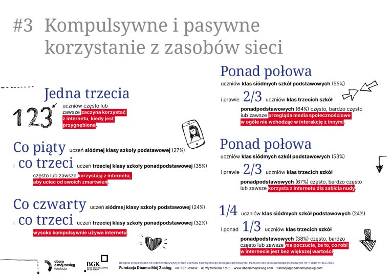 Nieprawdą jest, że cała młodzież jest zanurzona w internecie bez pamięci. Co 3 uczeń 3 klasy szkoły ponadpodstawowej i co czwarty uczeń 7 klasy szkoły podstawowej osiąga wysokie wyniki na skali kompulsywnego korzystania z internetu.